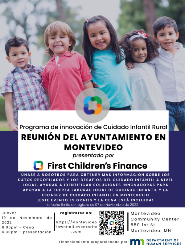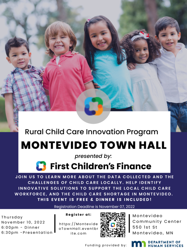 Montevideo Public Schools is partnering with community organizations as part of the Rural Child Care Innovation Program. We have challenges in our community regarding child care and through the help of Children's First Finance, solutions are being sought. Join us at Montevideo Town Hall on November 10th at the Montevideo Community Center to learn more about the data collected and the challenges of child care locally. Help identify innovative solutions to support the local child care workforce, and the child care shortage in Montevideo. Registration is required for this event. Reserve your spot by November 7th! Register at: https://www.eventbrite.com/e/m...