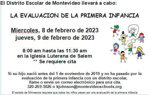 The Montevideo School District will hold Early Childhood Screening on Wednesday, February 8th & Thursday, February 9th, 8:00 a.m. until 11:30 a.m. at Salem Lutheran Church, 631 N 7th St, Montevideo, MN 56265. An appointment is required.